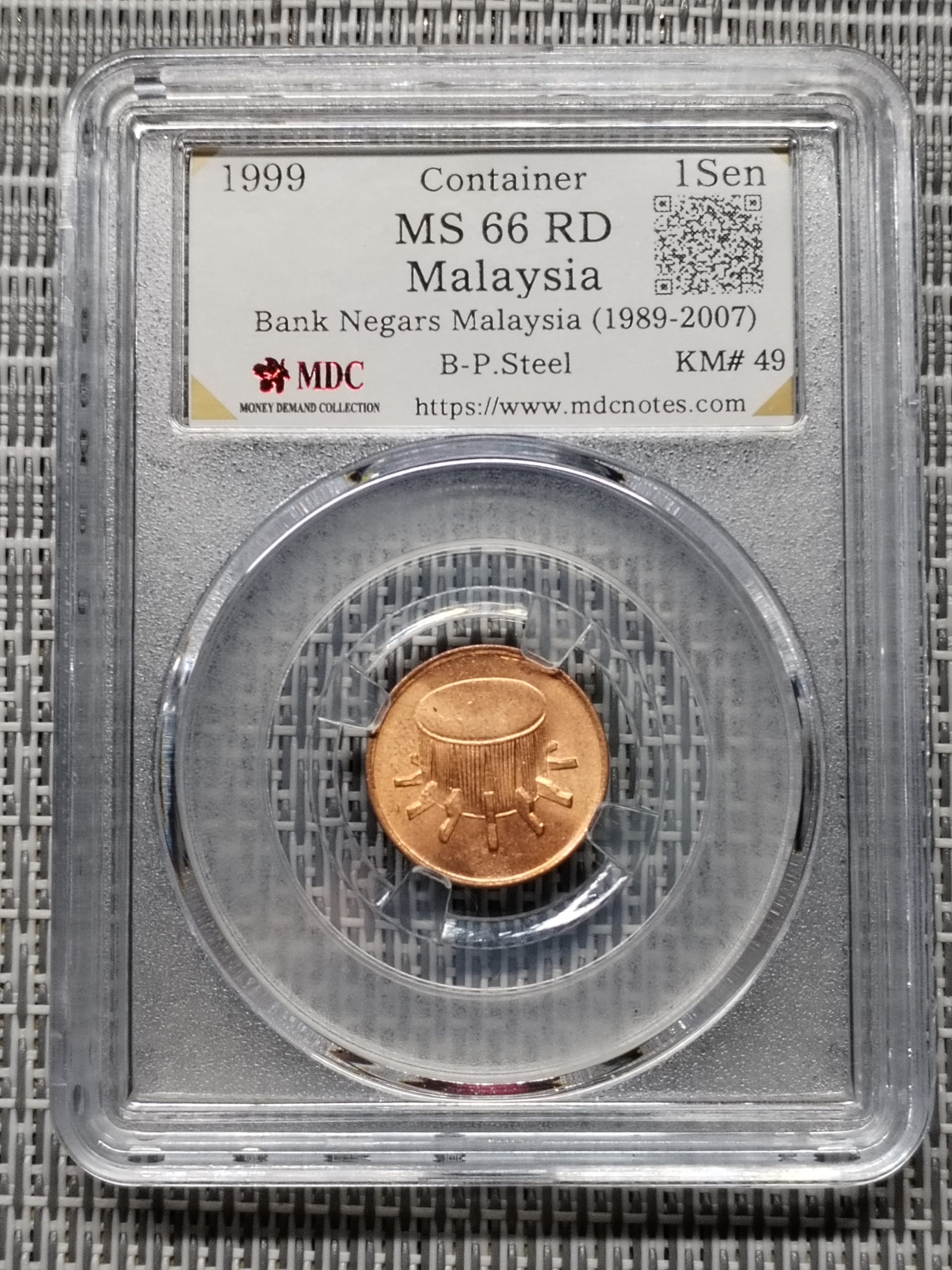 1999 Malaysia 1 Sen ” Container” 《 MDC Graded MS 66 RD 》
